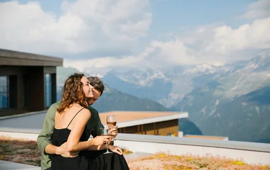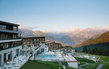 No coração de uma antiga pastagem alpina, o desafio arquitetônico desta construção é mesclar o Resort com a natureza e, assim, oferecer vistas sublimes. O telhado, verde no verão e branco no inverno, garante a sensação de integração ao cenário. No interior, tudo foi pensado para o seu bem-estar. Os quartos iluminados e funcionais, decorados com motivos florais, refletem a natureza ao redor.